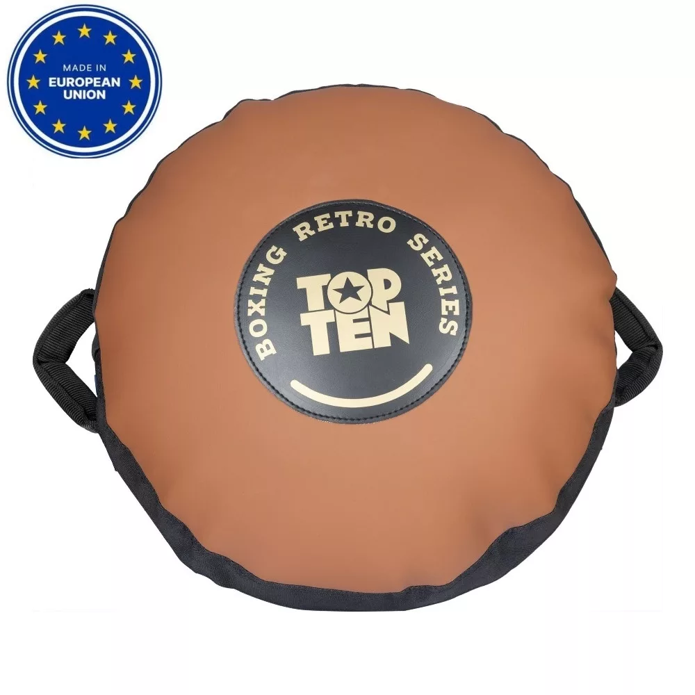 A TOP TEN „Retro Series” körpajzs elnyeli az agresszív, nagy erejű ütéseket is. Ez a jellemzője nagy mértékben köszönhető az erős ütéscsillapítású habszivacs magjának köszönhető. A borítás elől strapabíró szintetikus bőrből, hátulján szakadásálló szövetbetétből készült. A stabil tartás biztosítására a pajzs oldalain két párnázott fogantyú található. A „Retro Series” párna dizájnjában tisztelgés a régi idők előtt, a nyers és természetes színek voltak használatban. A Made in EU címkével a TOP TEN támogatja a gazdasági közösséget, gyorsítja a szállítást és erőforrásokat takarít meg, csökkenti a környezeti terhelést, ezzel megfelel a mai kor követelményeinek.