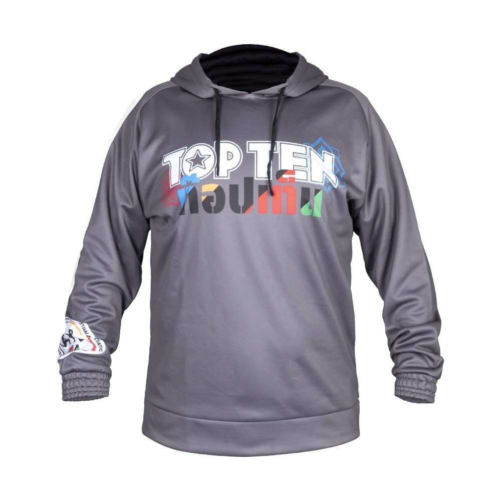 A Topten IFMA „Wai Khru” kapucnis pulóver nagyszerű választás szabadidős viseletnek is. Ez annak a tulajdonságának tudható be, hogy a bőröddel érintkező belső felülete puha, ezért jó közérzetet biztosít. Laza kialakításának köszönhetően gyorsan és könnyedén felvehető, és kapucnis kivitelének köszönhetően pillanatok alatt kizárhatod a külvilágot és csak a közelgő harcra koncentrálhatsz. A szorosan záródó mandzsetta kellemesen melegen tart, azáltal, hogy kizárja a szelet és a hideget. A 100%-ban poliészter szálakból készült „Wai Khru” funkcionális tulajdonságokkal rendelkező, teljesítményorientált ruhadarab. Az IFMA „Wai Khru” viselése kifejező dizájnja miatt biztosan maradandó benyomást fog gyakorolni környezetedre. Hátára a tipikus Muay Thai üdvözlőrituálé téma került, elülső részén és az ujjakon a TOP TEN és az IFMA logói keltik fel a figyelmet. A „Wai Khru” pulóver kiváló minőségű szublimált, és felelősséget vállal a fenntartható fogyasztói magatartásért.