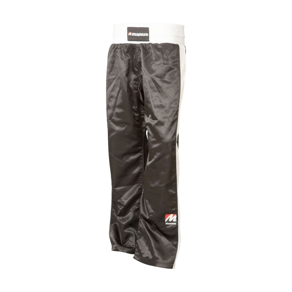 A Manus Kick-Box nadrág szinte kötelező darabja edzőtáskádnak. Anyaga könnyű, rugalmas és laza, de mindemellett maximális teherbírású. Ahogy a klasszikus Kick-Box hosszú nadrágoktól elvárható, egyenes szabású, enyhén fényes poliészter szaténból készült extra micro-mesh betétekkel. Jellemzője még a szélesre kialakított középső, lágyék résznél található betétrész és a kb. 8 cm széles gumírozott derékpánt.