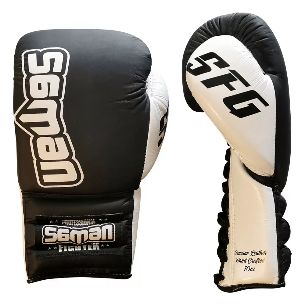 Boxing gloves, Saman, SFG, leather, with laces, Black-white, 10oz
