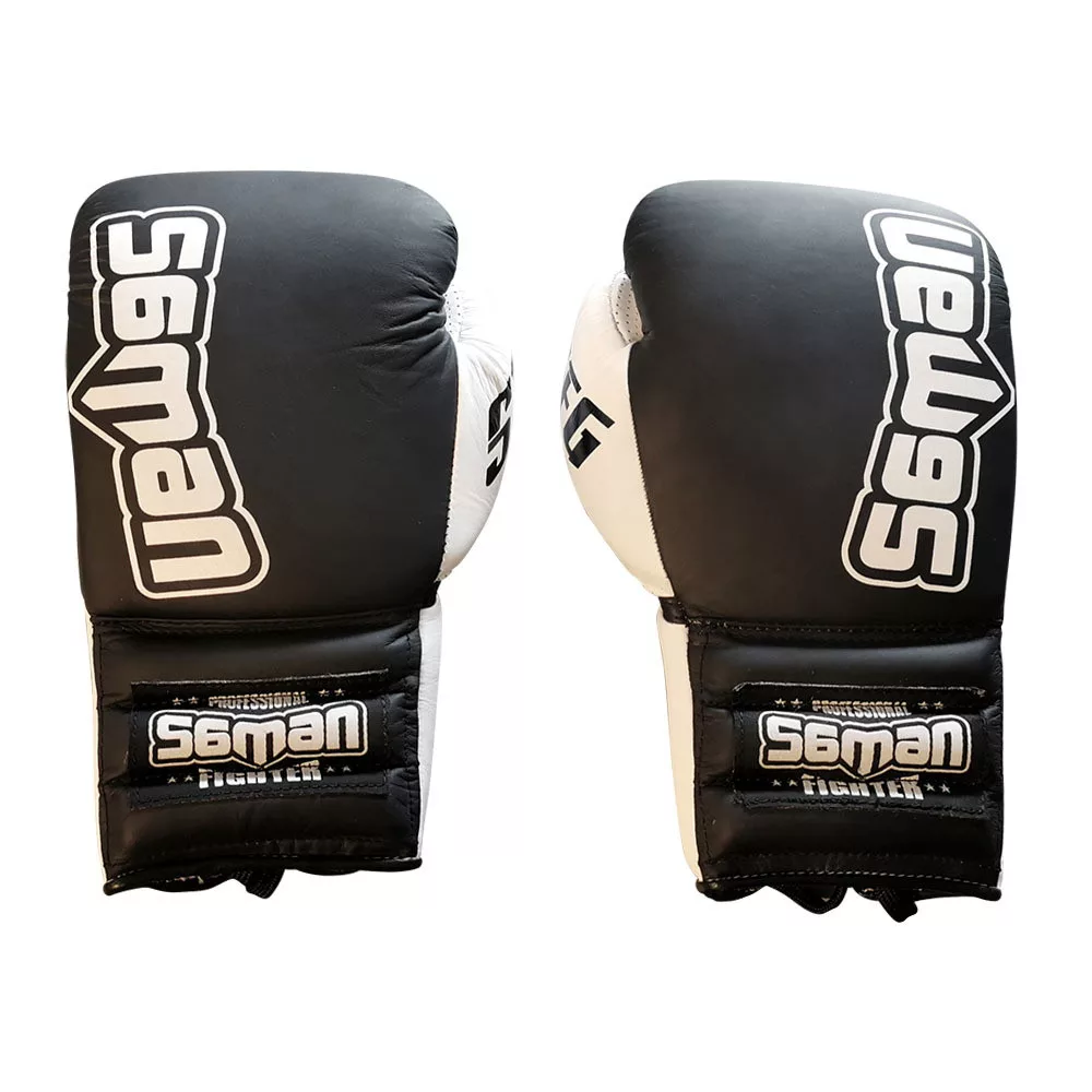 Boxing gloves, Saman, SFG, leather, with laces, Black-white, 14oz