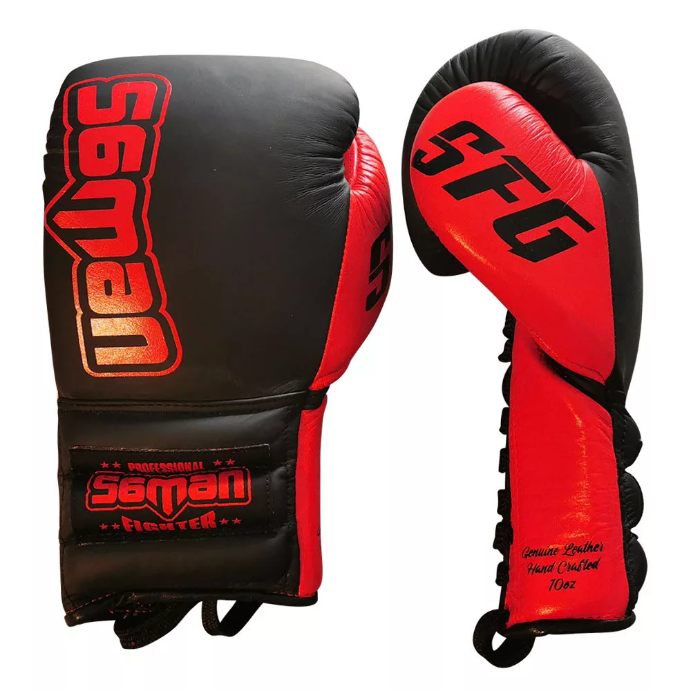 Boxing gloves, Saman, SFG, leather, with laces, Black-red, 12oz