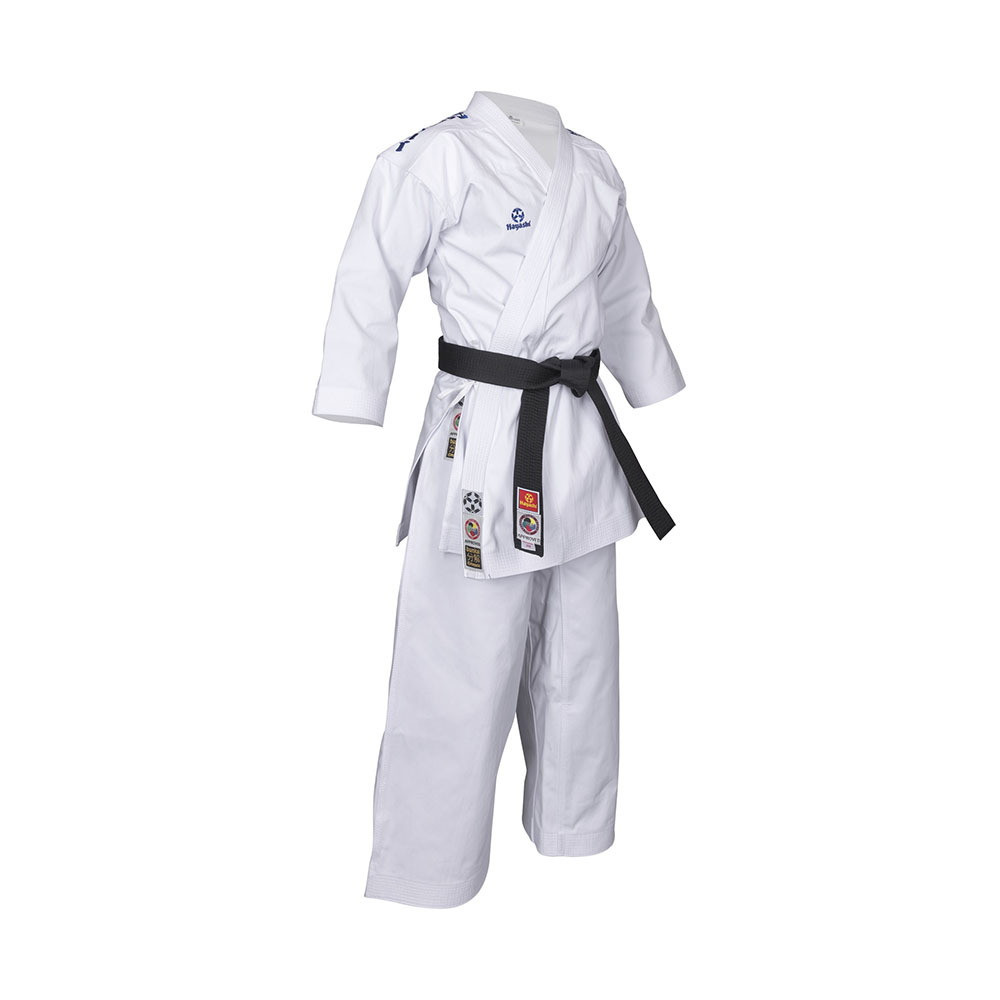 Vállait WKF és Hayashi logó díszíti a professzionalitás jeleképp.